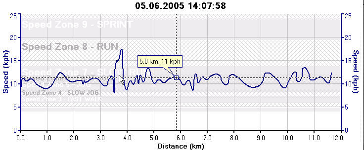 05_06_speedWie auch immer: ich lief mein mir auferlegtes Pensum und ab Kilometer 5 ca. machte es trotz des bescheidenen Wetters richtig Spaß. Mein Ziel war es, im Schnitt unter 6 Min./km zu bleiben, was mir auch gelang. Hierzu sei betont, daß der Forerunner einfach genial ist, da er permanent die aktuelle Geschwindigkeit anzeigt und ich somit ein Gefühl für die richtige Geschwindigkeit bekam.